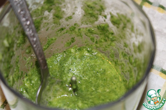 Готовлю заправку. Для этого в маленькой чаше блендера смешиваю зелень, чеснок, оливковое масло, лимонный сок, соль. Все взбиваю. Для заправки можно использовать любую зелень, ориентируйтесь на свои предпочтения.
