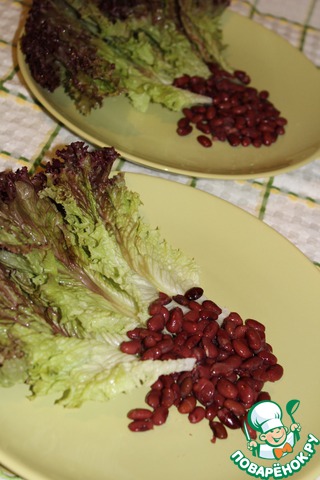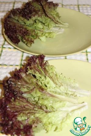На тарелки укладываю промытые и обсушенные листья салата, по три на каждую.