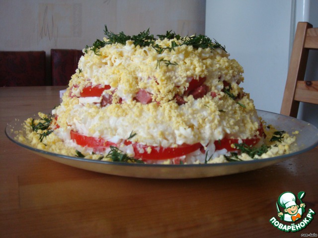 Первым слоем кладем рис, который уже перемешали с майонезом и чесноком, далее кладем нарезанную колбасу и тоже промазываем майонезом с чесноком, далее кладем помидор и тоже промазываем майонезом и чесноком, далее натертый сырок(майонезом не промазываем), далее, промазанный рис, колбасу, помидор(каждый слой не забываем промазывать), сырок и ещe раз рис (промазанный), далее кладем мелко порезанные белки и посыпаем весь салат измельчeнными желтками и украшаем укропом... Салат готов)))