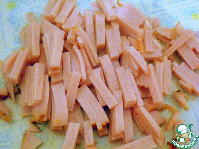 Ветчину нарезаем мелкой соломкой, длиной примерно 1,5-2 см.
