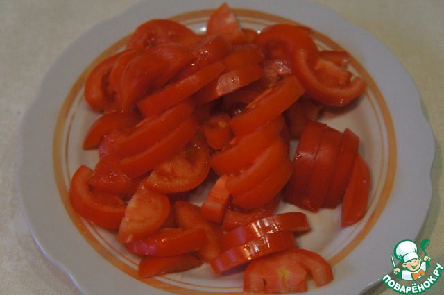 3 помидора разрезать вдоль пополам и затем нарезать поперек на ломтики (полукружками).