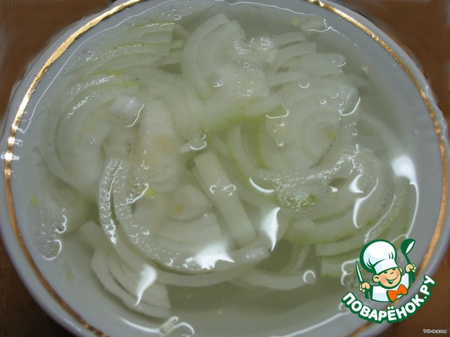 Избавляемся от горечи: Заливаем кипятком минут на 10 (я обычно на вкус проверяю, чтобы был еле уловимый луковый вкус), затем заливаем холодной водой и оставляем до момента смешивания.