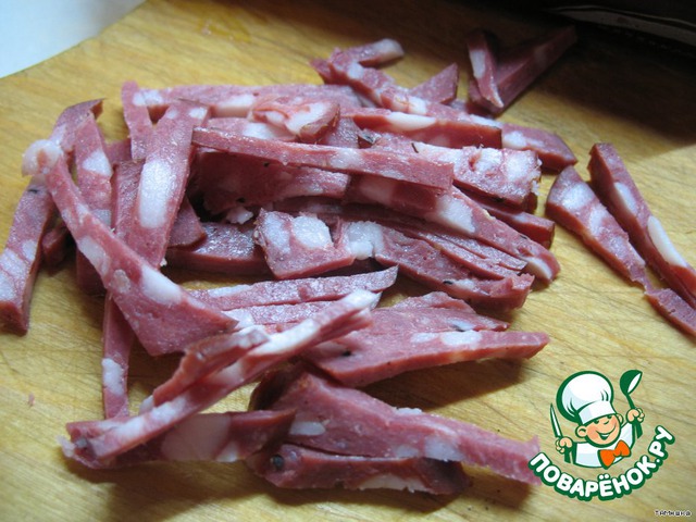 Соломкой нарезаем колбасу и/или ветчину. На повтор для фотосессии ветчины не осталось - обошлась колбасой.