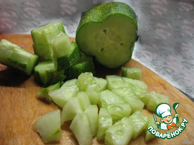 Огурцы режем кубиками примерно с зерна кукурузы.