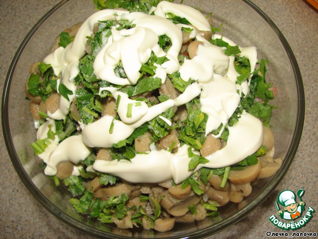 Измельченную зелень добавить к остальным ингредиентам. Все посолить, заправить майонезом и хорошенько перемешать. Приятного аппетита!