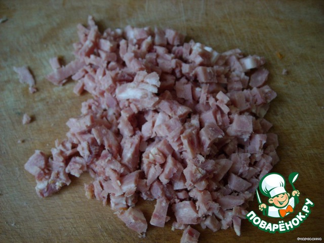 Морковь отварить, нарезать кубиками, ветчину тоже кубиками, сыр натереть на терке, лук мелкой крошкой, все соединить, добавить чеснок, заправить майонезом.