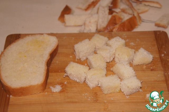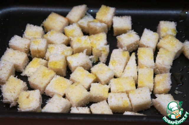 Нарезать батон кубиками, поместить в противень, слегка сбрызнуть маслом и запечь в духовке до румяной корочки, приблизительно 12-15 минут.