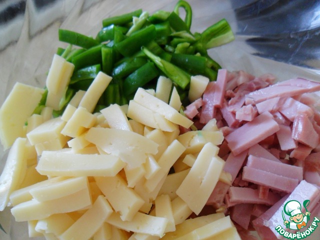 Поставить варить макароны. Я взяла перья, потому что все ингредиенты резала соломкой. Пока вода закипает, грудинку, сыр и перчик порезать соломкой и сложить в салатник.