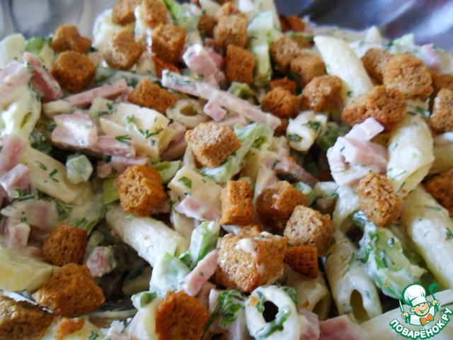 Перед подачей заправьте соусом, перемешайте и посыпьте сухариками. Этот салатик так же можно презентовать как закуску на ломтиках помидоров! Обязательно попробуйте!