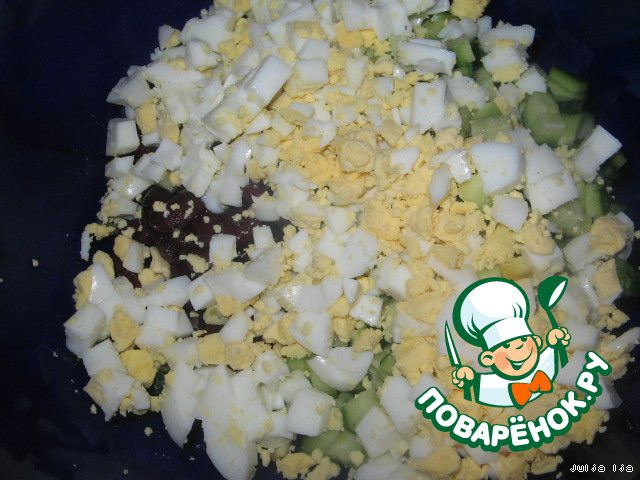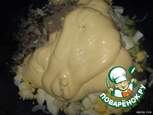 Посолить и поперчить - по вкусу. Добавить майонез. Перемешать и подавать на стол.