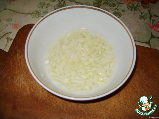 Лук мелко покрошить, залить кипятком, оставить на 10 минут, чтобы вышла горечь. Затем воду слить, а лук сполоснуть в холодной воде.