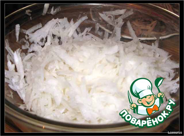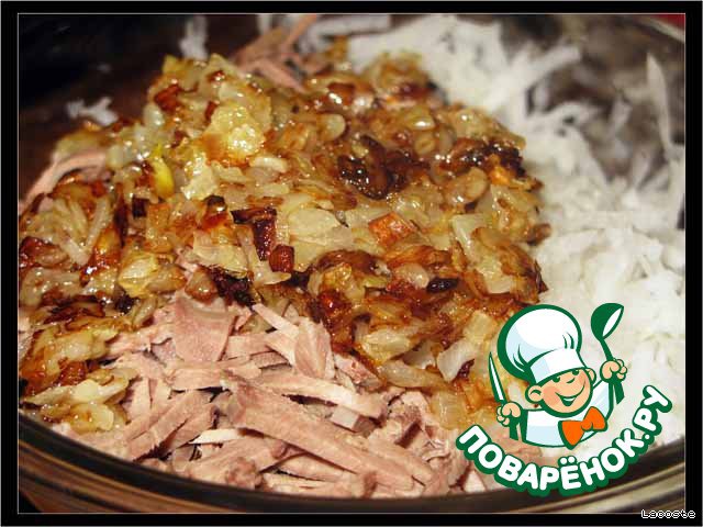 | Сытный, вкусный салат из дайкона, телячьего языка и жареного лука. |