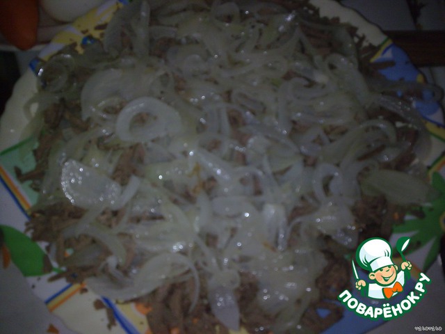 Печень говяжью отварить до готовности, при варке посолить. Остудить. Лук нарезать тонкими полукольцами,обжарить до прозрачности.