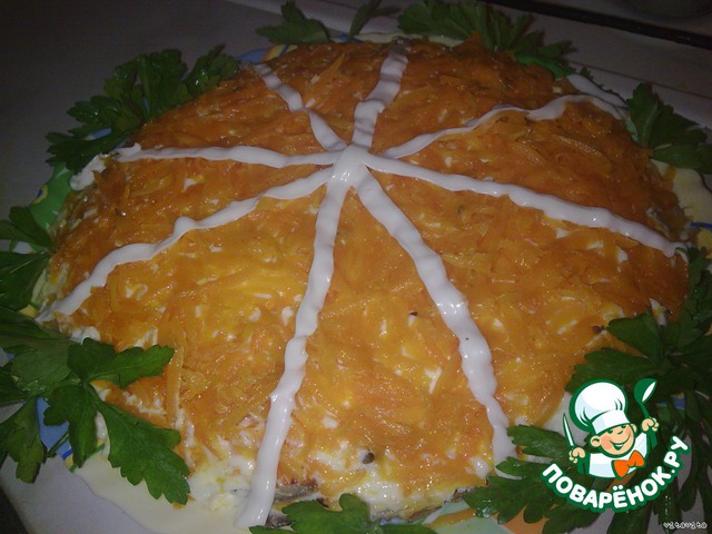 Начнем с печени. Печень очистить от пленки и жилок. Поставить варить и посолить. Сварить яйца. Лук нарезать тонкими полукольцами и обжарить на растительном масле. Вытащить лук шумовкой, чтобы стек жир. И в этом же масле обжариваю морковь(натертую на крупной терке). Морковь так же вытащить шумовкой. Все продукты подготовлены, начнем выкладывать слои. На дно плоской, большой тарелки натереть печень. Второй слой, обжаренный лук, а сверху майонез. Третий слой яйца, натертые на крупной терке. Яйца, так же покрыть майонезом. Четвертый слой обжаренная морковь. Украшаем зеленью петрушки и майонезом. И еще один очень важный момент, салат , обязательно, должен пропитаться