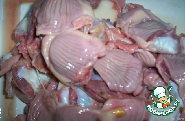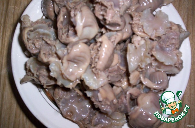 - отварить желудки в кипящем рассоле 2 часа (2 литра воды+2 ст. ложки соли+морковь+лук+перец+лавровый лист), остудить желудки не вынимая из жидкости