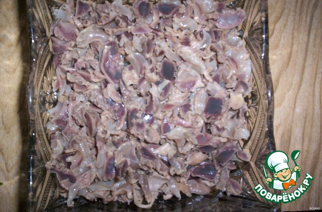 | Главным ингридиентом салата являются куриные желудки. В салате по вкусовым качествам желудки очень близки к вкусовым качествам языка (свиного или говяжьего). |