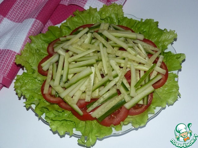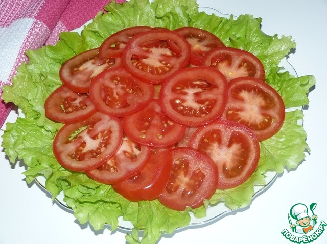 Листья салата разложить на блюдо. На салат разложить помидоры, нарезанные кольцами.