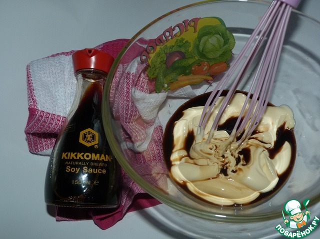 Приготовить соус. Для этого надо хорошо смешать майонез и соевый соус.