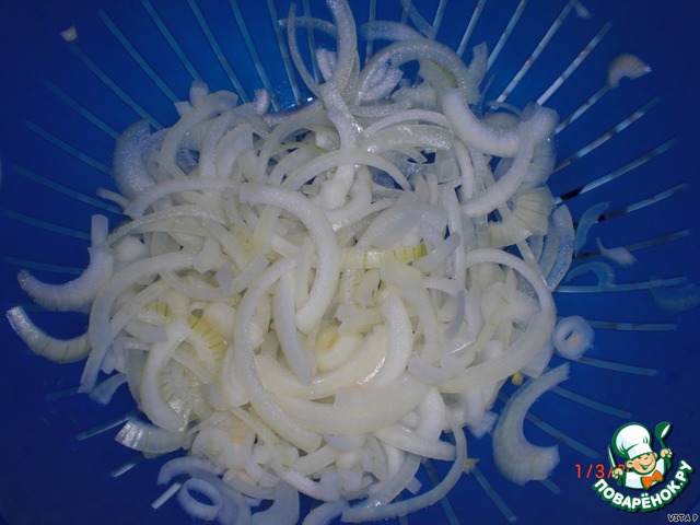 Лук почистить, измельчить полукольцами, количество должно быть одинаковым с количеством сердца, высыпать в дуршлаг и поливать кипятком в течении 30 секунд, промыть холодной водой.
