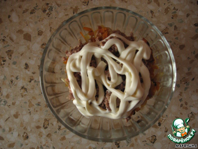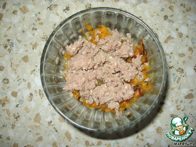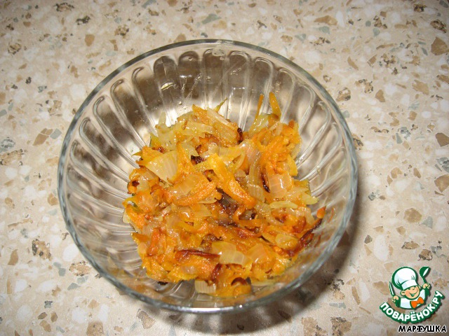 Обжариваем морковь с луком, и выкладываем первым слоем.