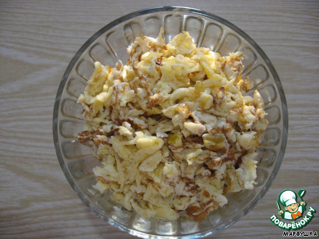Берем яйцо, смешиваем с 2 ст. л. молока, взбиваем, добавляем соль. Выпекаем тонкие блинчики (у меня 5 получилось). Сворачиваем блинчики рулетиком и нарезаем тоненькими-тоненькими полосками. Добавляем сверху.