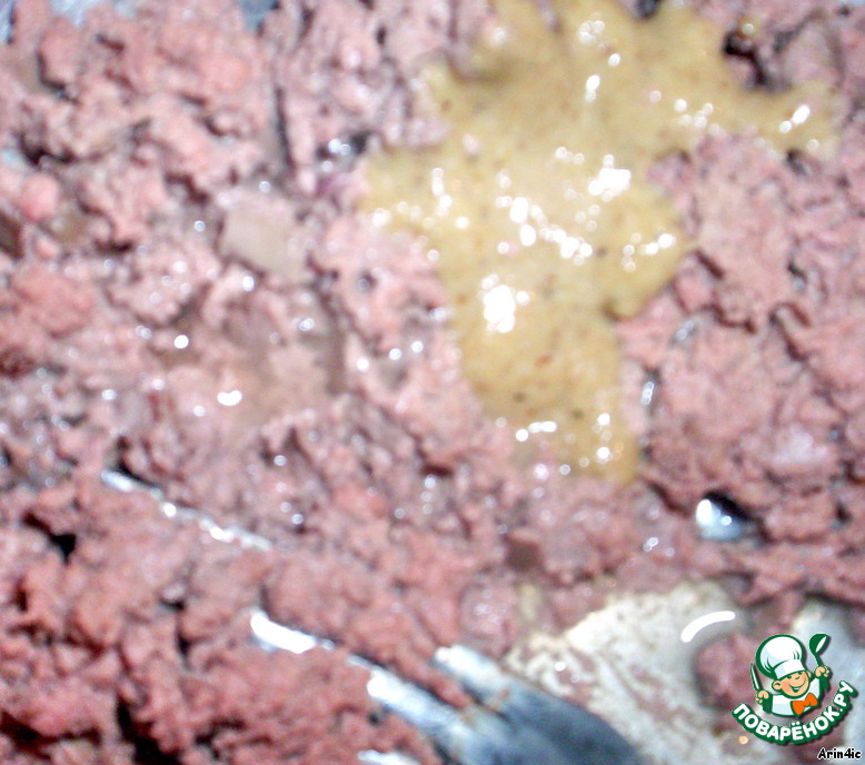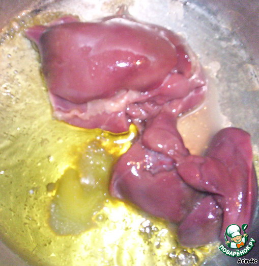 На топленом сливочном масле слегка обжариваем куриную печенку. Вливаем 2 ст.л. бульона или воды и тушим на маленьком огне до побеления печени.