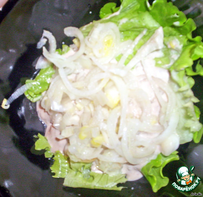2 слой: нарезать тонкими кольцами лук, обдать его кипятком и отжать. Выложить поверх салата и полить соусом.