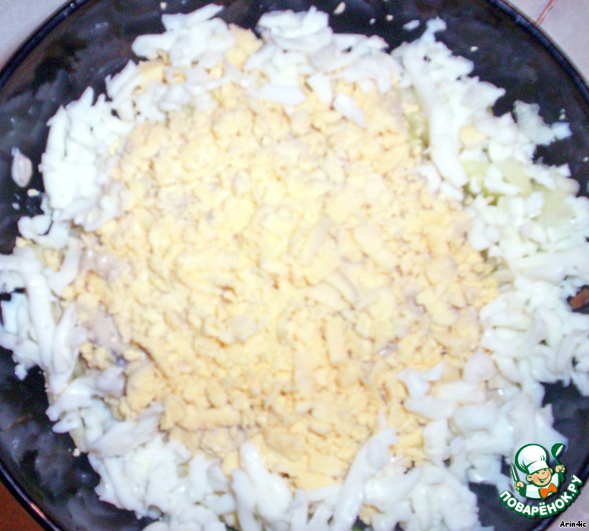 3 слой: натереть на терке белки. Выложить в салатницу и полить соусом.
