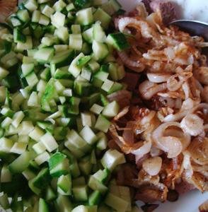 Обжарить лук репчатый, нарезанный кольцами и добавить огурец резанный кубиками