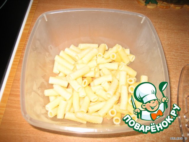 Блюдо готовится быстро, чтобы ингредиенты (макароны и сердечки) не остыли, а сухарики не стали мягкими... Кстати, этот салатик мне нравится и в холодном виде.