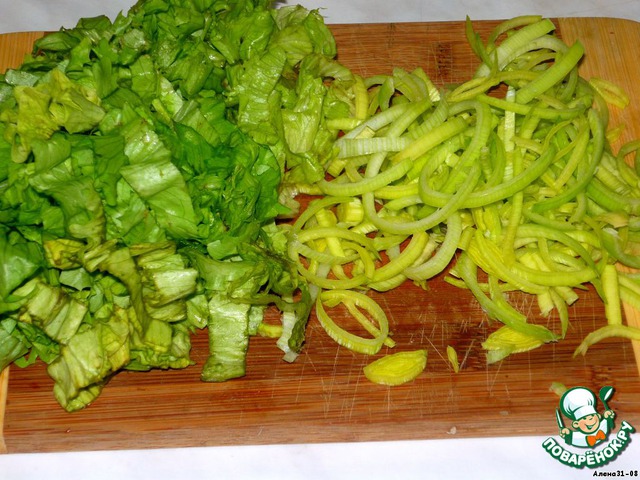 Режем полосками салат и лук.