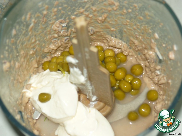 Желудки и сердца тоже режем подобием соломки. Всё, что нарезали, складываем в салатник, добавляем половину горошка. Печень вместе со сливками взбить в блендере, добавить сметану и горошек и снова взбить. Поперчить.