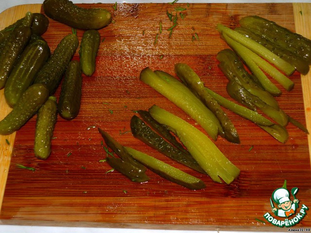 Соломкой же нарезаем огурчики. У меня были корнишоны, но лучше мой подвиг не повторять и взять огурцы нормального размера.