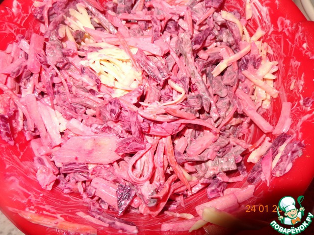 Трем сыр на крупной терке. Смешиваем все ингридиенты, заправляем майонезом. Даем салатику настояться..