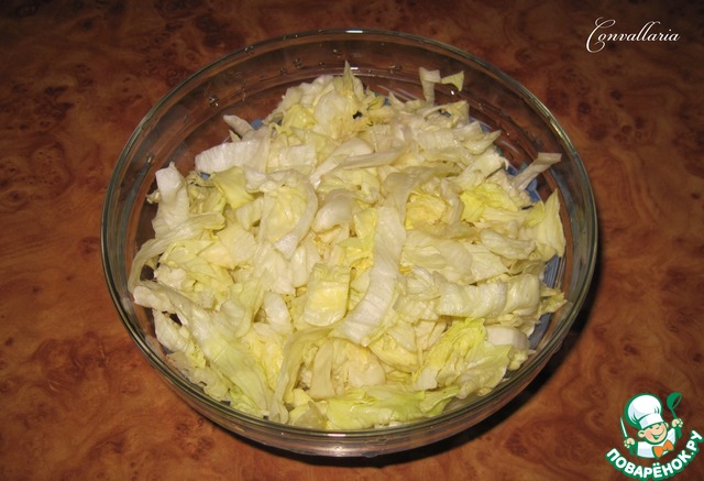 Листья салата «Айсберг» промыть, обсушить, мелко нарезать или порвать руками.
