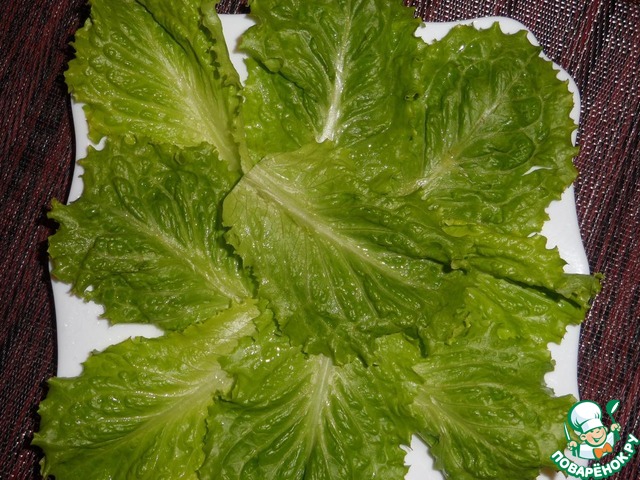 Листья салата вымыть и обсушить. Выложить слой листьев на плоское блюдо.