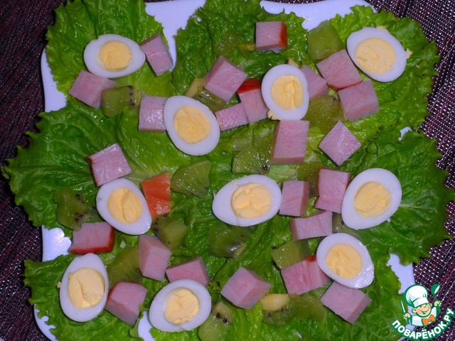 Добавить нарезанные кубиком мясо и киви. Перепелиные яйца разрезать на половинки и выложить на блюдо.