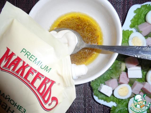 Выложить по 1 ч. л. заправки на половинки яиц и немного по салату. Салат готов. Приятного аппетита!