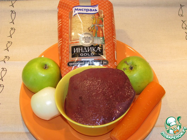 Для приготовления этого салата нам понадобится: Печень говяжья или куриная, рис пропаренный длиннозерный Индика Gold от ТМ "Мистраль", лук репчатый, морковь, небольшие зеленые яблоки.