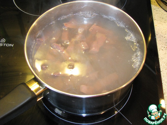 В кипящую подсоленную воду опускаем печень и припускаем ее до изменения цвета. Из нее выйдет много пены. Чтобы пены не было в салате. Затем воду слить, а печень порезать помельче.