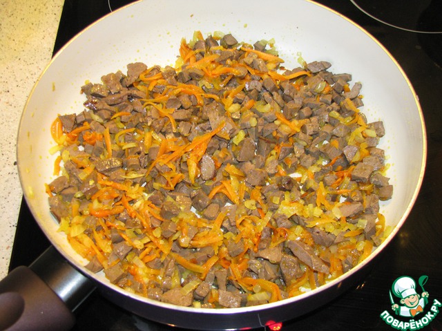 Добавить печень, соль перец и еще немного обжарить, помешивая.