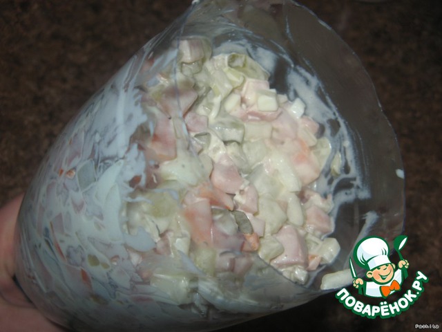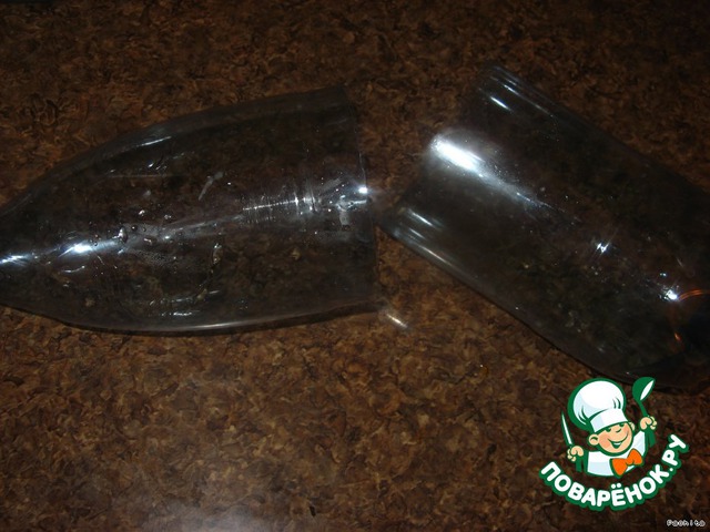 Разрезать пластиковую бутылку на половину. Конусообразную часть заполнить салатом, утрамбовать.