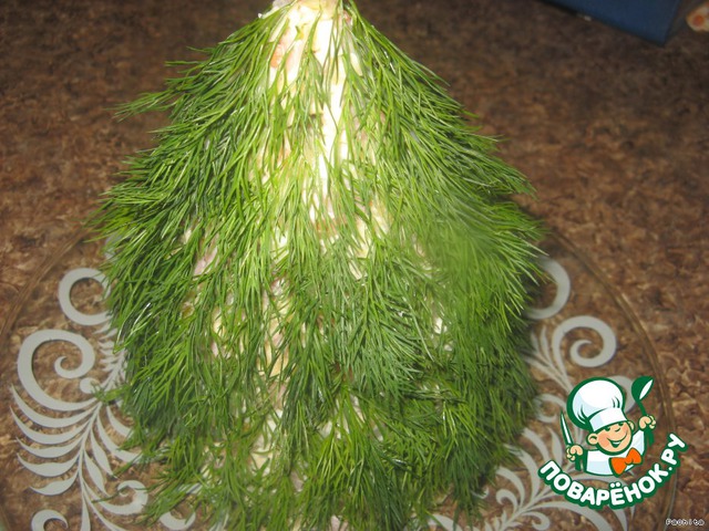 Укроп разобрать на веточки. Обложить основу салата , начиная с низу.