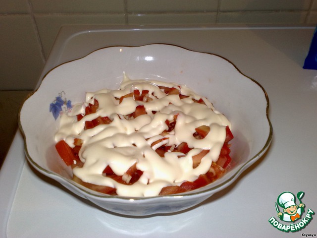 3 слой - посыпать измельчённым чесноком и сделать сеточку из майонеза