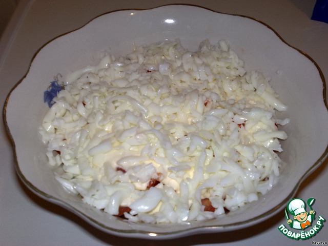 4 слой - посыпать натёртым на тёрке белком и сделать сеточку из майонеза