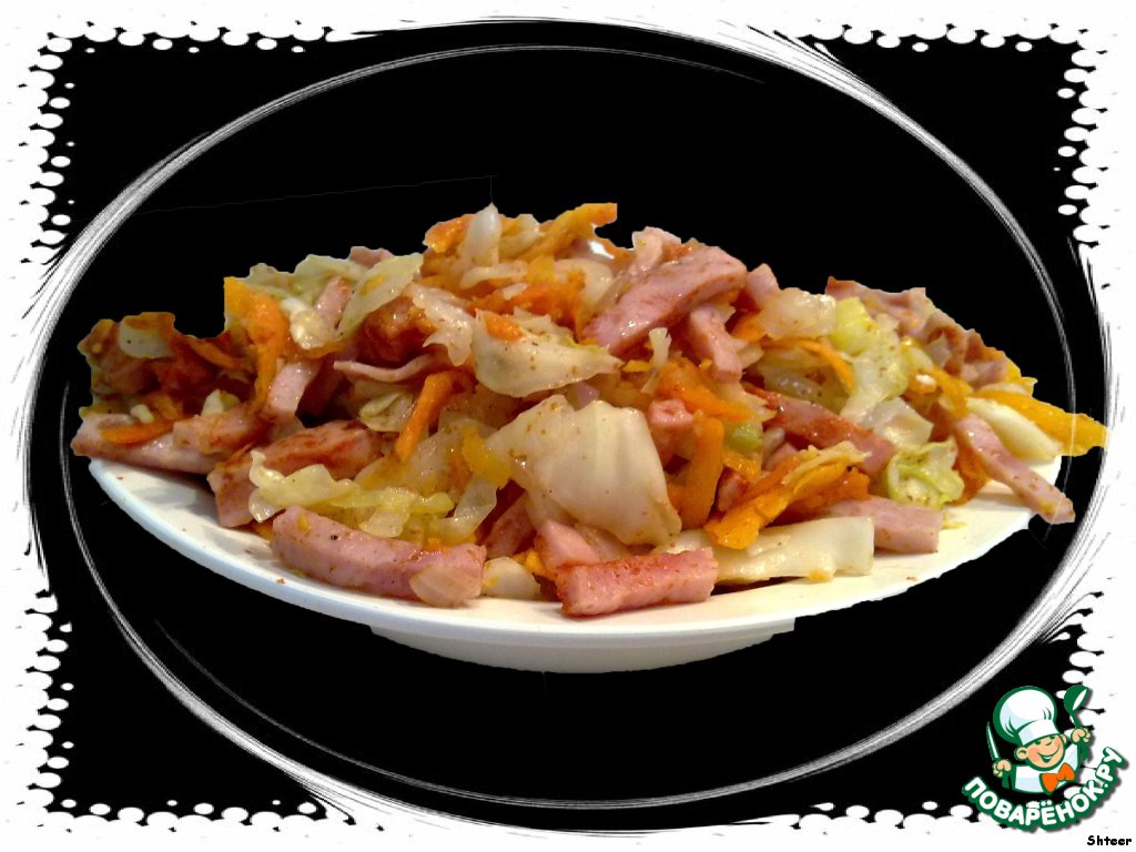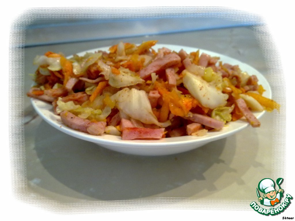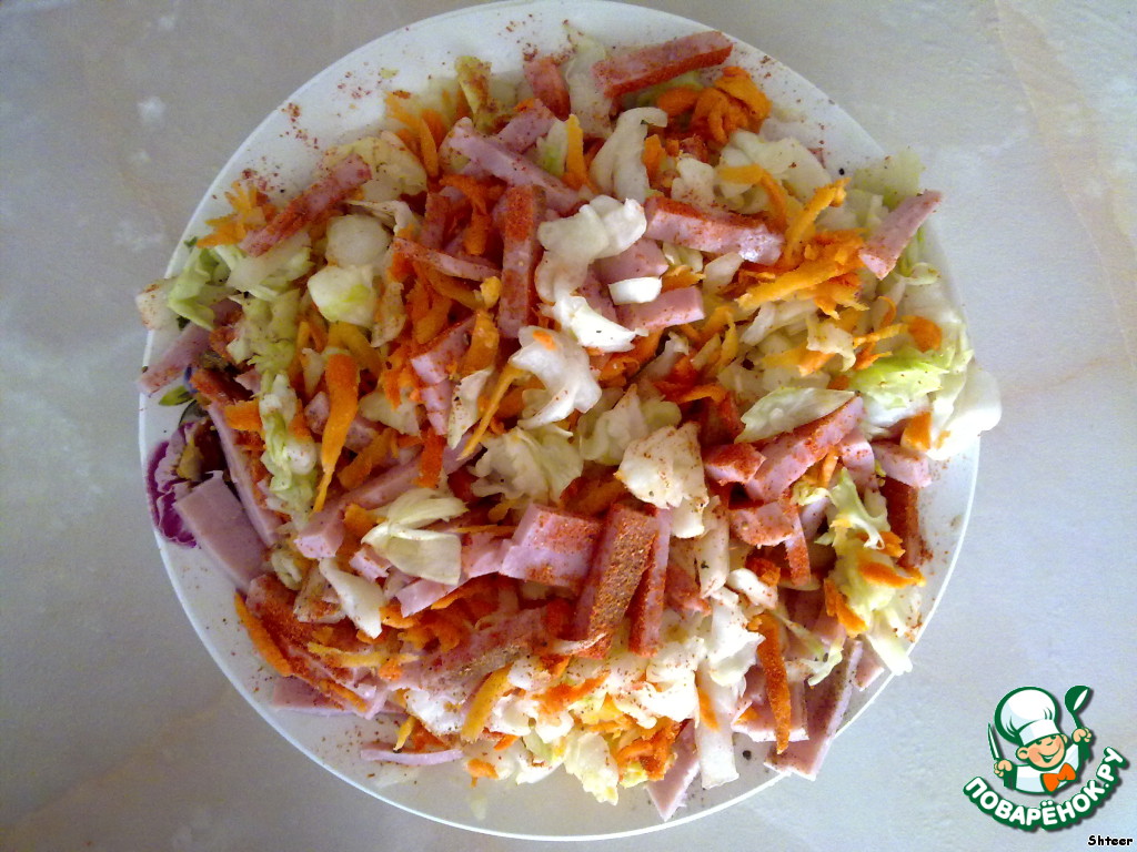 Убрав гнёт, хорошенько перемешать. Готовый салат не потребовал ни капли масла для заправки за счет жира, содержащегося в ветчине, и капустного сока (но если, все же, салатик показался вам суховат, можете добавить пару капель растительного масла).