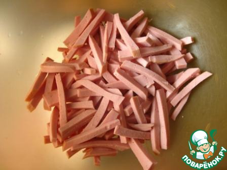 Колбасу порезать брусочками.