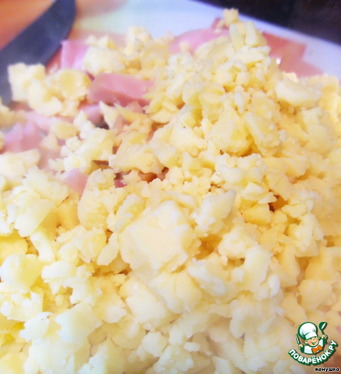 Ветчину нарезать кубиками. Сыр измельчить в блендере или на крупной терке.