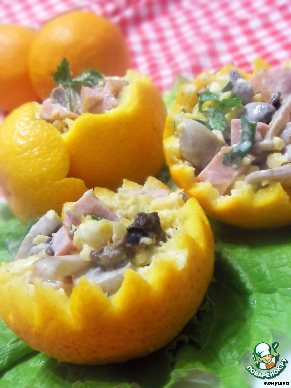 Салат выкладываем в корзинки из апельсина и украшаем по вкусу))