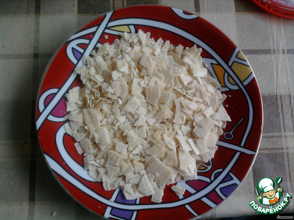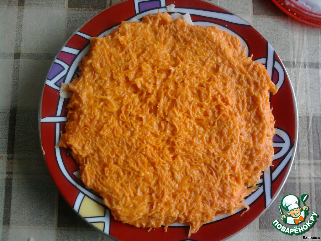 Морковь чистим, трем на мелкую терку, добавляем чеснок, смешиваем с майонезом и укладываем на чипсы.